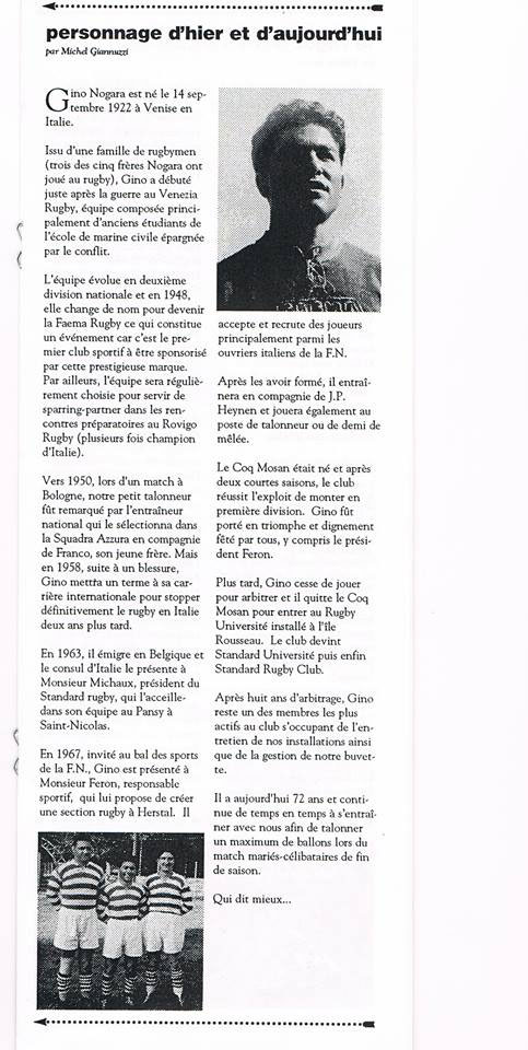 Gino a marqué de sa personnalité et de sa passion le rugby liégeois et je vous joint un petit article que nous avions rédigé dans le journal du Standard Rugby en 1995.