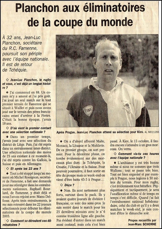 Quand on parle rugby en terre marchoise , c’est inévitablement à Jean-Luc Planchon à qui on pense en premier. Ce dernier roule en effet sa bosse sur les terrains depuis plus de 30 ans. Il débuta sa carrière en 1987 dans les pâtures de Waillet sous les couleurs de Famenne. Très vite, il progressa et devint l’un des pions majeurs qui mena le club marchois au plus haut niveau pendant quelques années.