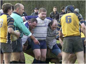 ![]() Face au ROC, la première ligne de Boitsfort ne manquait pas d’expérience avec Francis Demolder, Christophe Duret et Philippe Tollet. (Photo Sportkipik.be) |